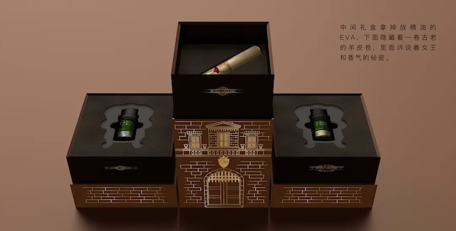 Unboxing it feels just like an archaeological excavation. Remove the card printed with "The Queen’s Throne", and you’ll find three essential oil bottles featuring striking color-block screen prints. Lift the EVA layer with a semicircular pull tab, and a scroll of parchment is surprisingly hidden at the bottom.